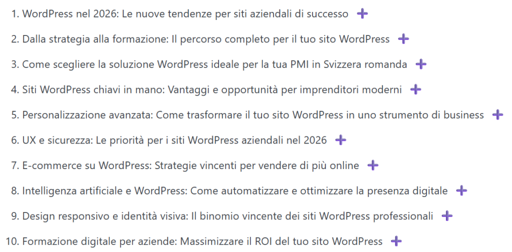 Sulla base di queste informazioni, il plugin genera idee per articoli pertinenti e poi scrive contenuti ottimizzati per la SEO, pronti per essere pubblicati direttamente sul tuo sito WordPress.